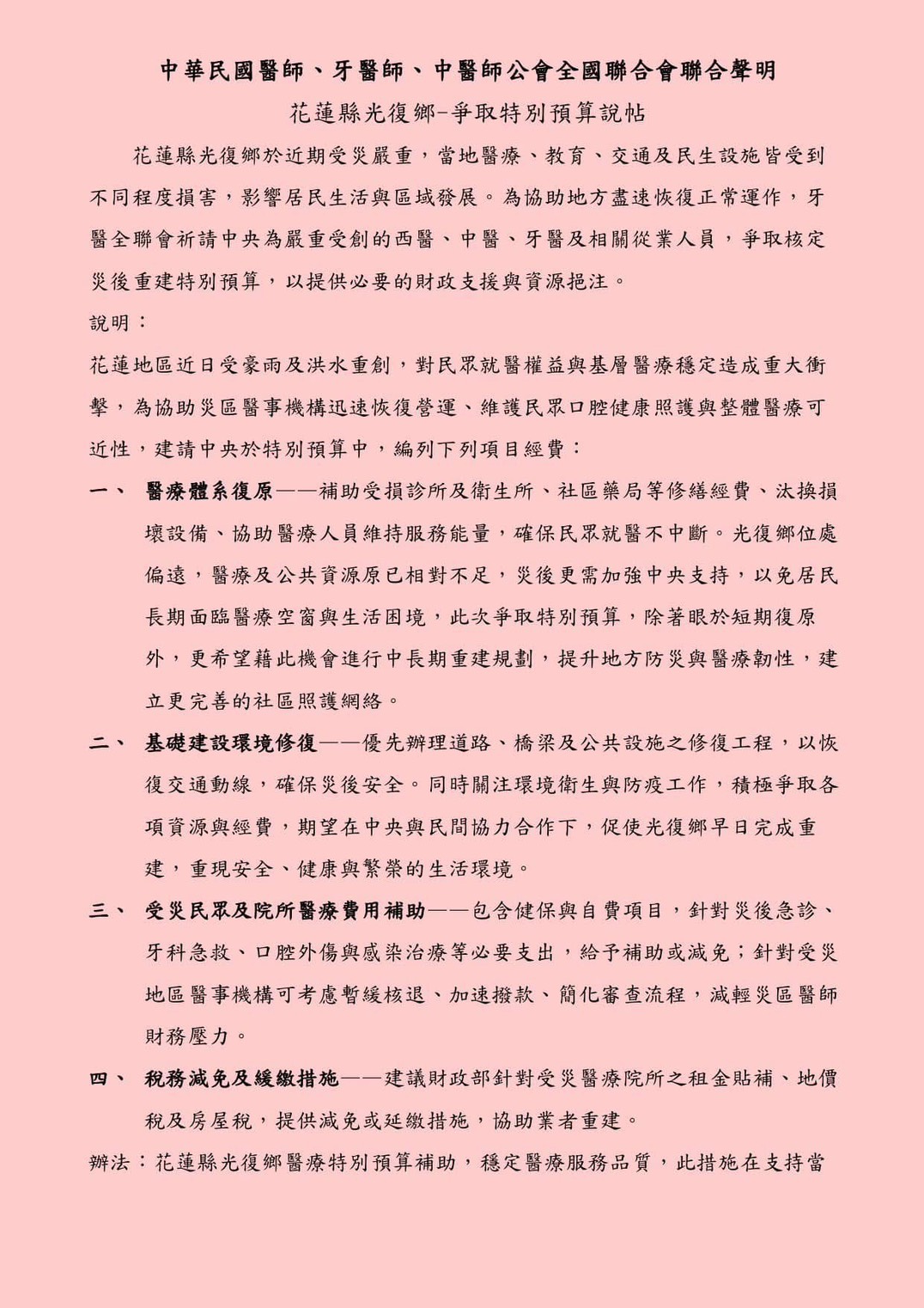中華民國醫師、牙醫師、中醫師公會全國聯合會聯合聲明 花蓮光復鄉-爭取特別預算說帖